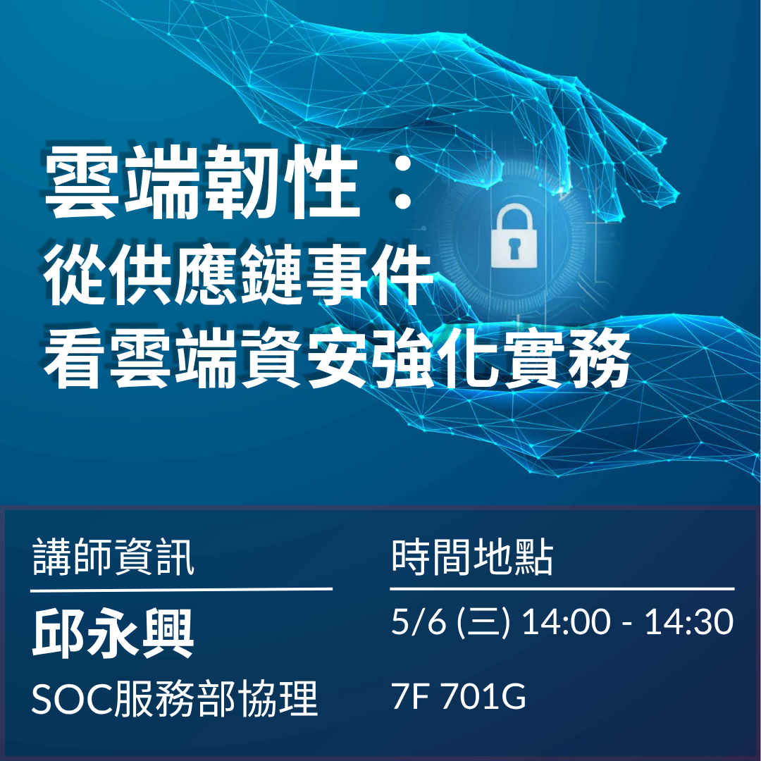 更多中華資安國際將參與「2026 CYBERSEC 臺灣資安大會」,隨著全球數位轉型進入深水區,駭客攻擊手段日益精進,企業面臨的威脅已不僅止於單點攻擊,更是針對供應鏈與核心基礎設施的系統性挑戰。資安漏洞不應成為企業發展的隱憂;相反地,透過精確的防禦策略,能將安全轉化為企業最具競爭力的核心價值。中華資安2026年「以AI賦能資安,以資安守護AI」為策略主軸,我們誠摯邀請各界先進蒞臨指導,與我們的技術專家面對面交流,共同守護企業數位未來,別讓資安漏洞成為企業發展的絆腳石,我們將於 Q105 攤位展示專業的防護技術與實戰策略。【活動資訊】活動名稱:2026 CYBERSEC 臺灣資安大會活動日期:2026/05/05 (二) - 2026/05/07 (四)活動時間:9:00 - 17:00活動地點: 台北南港展覽館二館1樓攤位編號:Q105本次中華資安將展示最先進之 AI SOC 服務、AI 應用系統安全檢測服務、AI資安健診、AI 賦能之資安曝險評級服務 HorusEyes、全新 SecuTex NP/ED系列,整點時攤位亦有技術快講,歡迎您前來交流。此外另有多場專家論壇,誠摯邀請您一同前來聆聽。論壇時間會議室議程雲端論壇5/6 (三)14:00 - 14:307F (701G)雲端韌性:從供應鏈事件看雲端資安強化實務AI Security Safety論壇5/7 (四)09:30 - 10:004F (4B)雙生共競:生成式AI驅動的自動化防禦演進與信任架構實踐Cyber Technology Innovation論壇5/7 (四)10:15 - 10:457F (701H)Cyber Innovation:重塑網路與端點的威脅獵捕防線AI Defense論壇5/7 (四)11:45 - 12:307F (701F)學資安的AI不會變壞,但會搶飯碗?攻擊型安全論壇5/7 (四)14:45 - 15:157F (701E)是不是我的18歲 注定讓藍隊掉眼淚-MITRE ATTCK V18