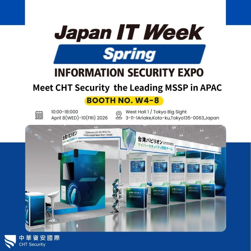 更多CHT Security が 日本 IT Week Spring Exhibition に 出展します!日本最大級のIT展示会がまもなく開幕!CHT Securityは、4月に東京ビッグサイトで開催されるJapan IT Week Spring Exhibition 2026にて、受賞歴を誇るサイバーセキュリティソリューションを展示いたします。7年連続で5Aセキュリティ評価を維持している唯一のセキュリティベンダーとして、プロアクティブな防御と脅威インテリジェンスにおける確かな専門知識を東京の舞台で披露いたします。ぜひブースにお越しください。展示会:Japan IT Week Spring Exhibition 2026開催期間:2026年4月8日(水)~4月10日(金)開催時間:10:00~17:00会場:東京ビッグサイトホール:ウエストホール1ブース番号:W4-8当社の専門スタッフが、以下の内容についてご説明いたします。SOCおよびMDRサービス:グローバル24時間365日監視レッドチーム演習およびペネトレーションテスト:実際の攻撃に対する防御力をテストセキュリティ態勢評価:インフラストラクチャがグローバルスタンダードを満たしているかを確認脆弱性管理:悪用される前に脆弱性を特定します。新たなセキュリティパートナーをお探しの方も、サイバーセキュリティの最新動向についてご相談されたい方も、ぜひお気軽にご連絡ください。東京でお会いしましょう!