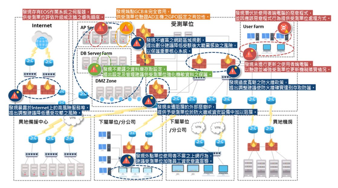 サイバーセキュリティ健全性サービスの顧客層には、政府機関、学術機関、国有(公営)企業、大企業、医療機関などが含まれます。過去の数百件のサービス事例では、それぞれの検出側面で点検対象組織/部門が現在のサイバーセキュリティ保護アーキテクチャの脆弱性を検出するのを支援してきました。対応するリスクの説明と改善案を提示することで、点検対象組織に主に以下の具体的な効果と利点をもたらすことができます。