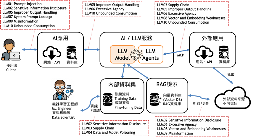 - 專屬 AI 檢測項目:引入OWASP Top 10 for LLM、MITRE ATLAS、NIST AI RMF 等國際標準,涵蓋模型操縱(Model Manipulation)、資料投毒(Data Poisoning)、提示語注入(Prompt Injection)、越權存取(Unauthorized Access)、機密洩露(Sensitive Data Disclosure)等重點測項。